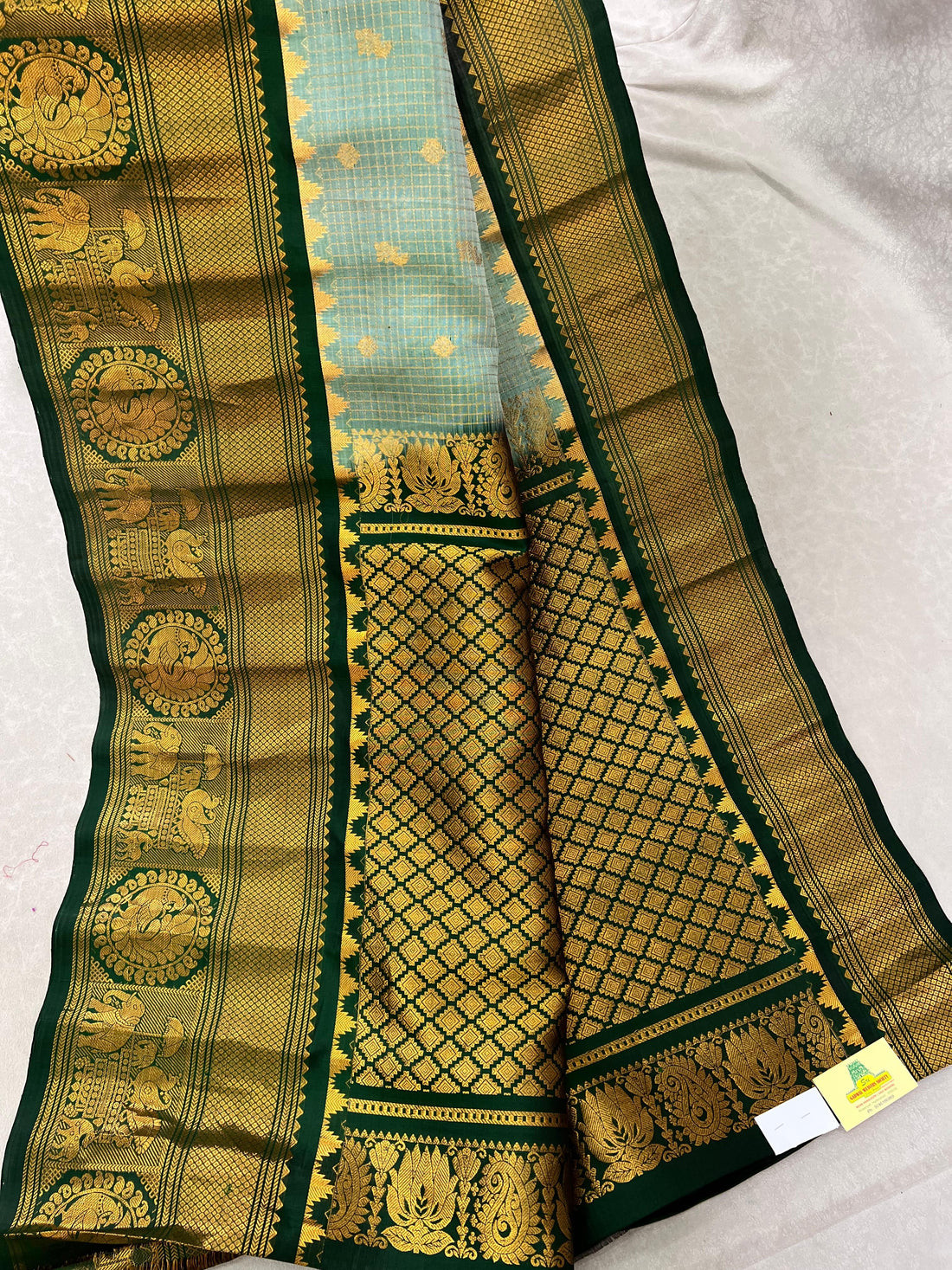This exquisite Gadwal Pure Silk Handloom Saree features a Mint green body adorned with elegant gold zari checks and delicately woven gold buttas, showcasing the timeless beauty of traditional craftsmanship. The saree is elevated by its striking big dark green border, intricately designed with shimmering gold zari that adds a bold and regal contrast, this saree is perfect for weddings, festive occasions, and cultural celebrations. A true blend of heritage, luxury, and elegance. Paired with a contrast blouse and it is Silk mark certified.