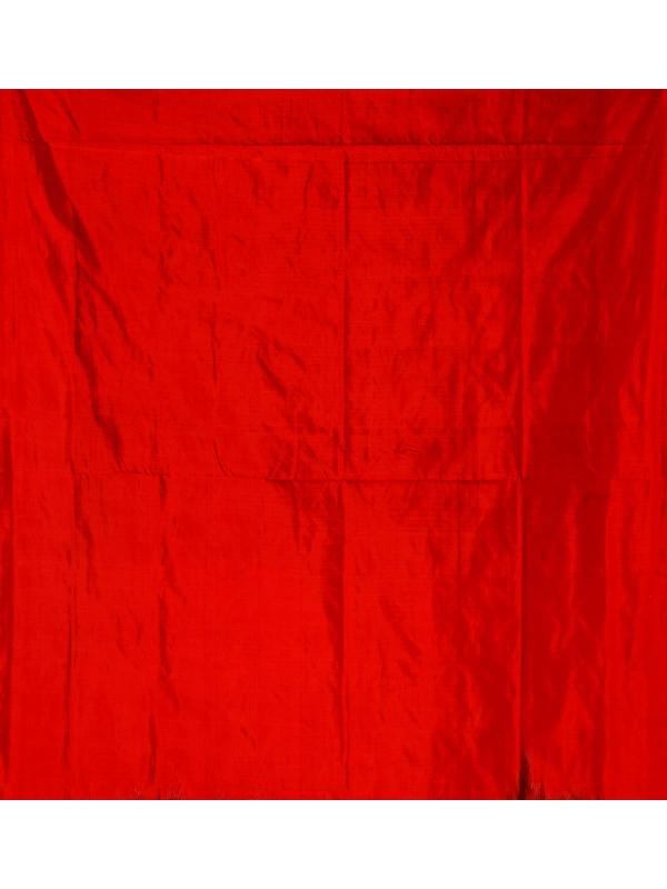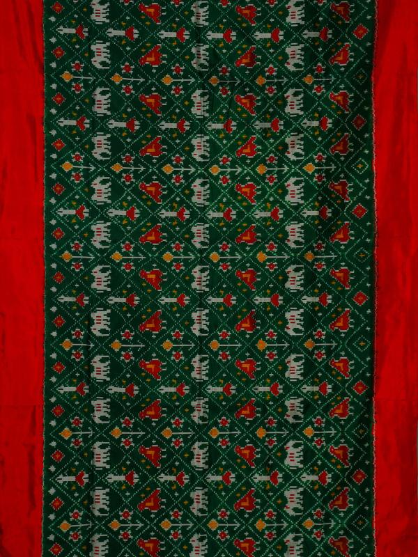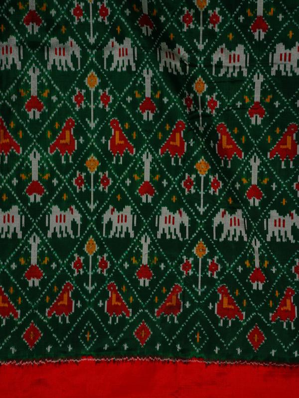 This dark forest green and red handloom Pochampally silk Ikat saree from Telangana has beautiful patterns made using a traditional dyeing method. Pochampally Ikat is a very old weaving style where the threads are dyed before weaving, which creates unique designs. The soft mulberry silk fabric gives the saree a nice, smooth fall. The bright colours and geometric patterns make it stand out. This saree is a great choice for special occasions and for anyone who loves real, traditional Indian handloom.