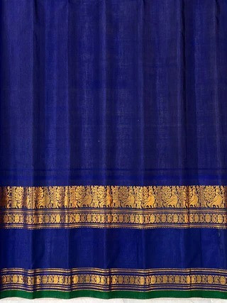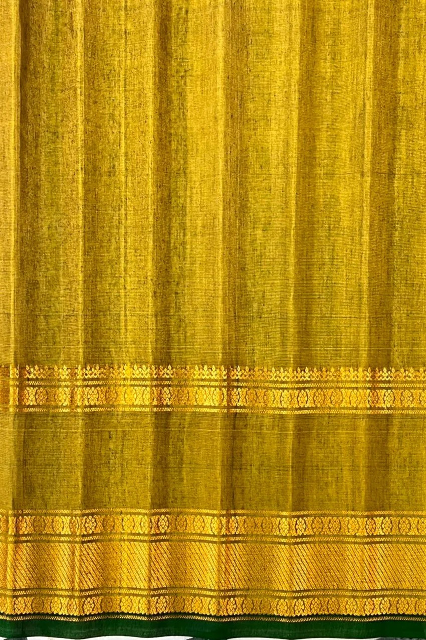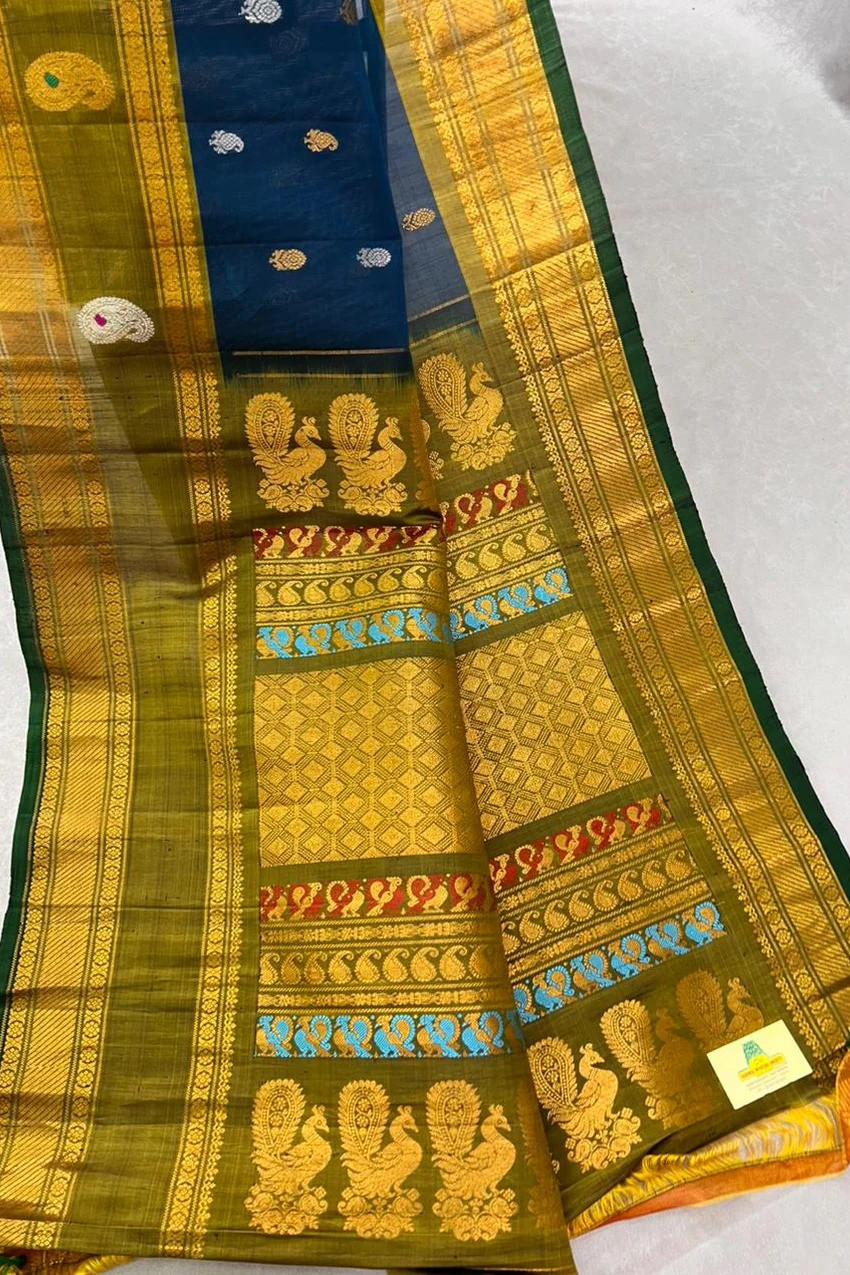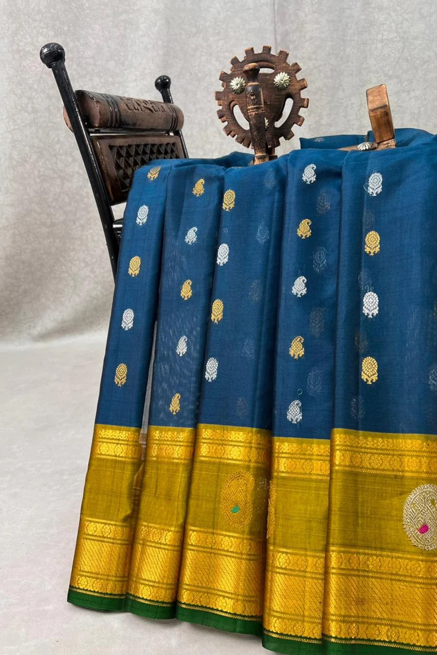 This elegant Gadwal Cotton Silk (SICO) Handloom Saree features a Rama blue body adorned with delicate gold and silver buttas, creating a timeless charm. The Honey yellow meena butta gap border are intricately woven with floral gold zari work and finished with a Green selvedge, giving the saree a graceful and traditional look. Lightweight and breathable, it is perfect for festive occasions and summer functions. This saree comes with a contrast blouse.