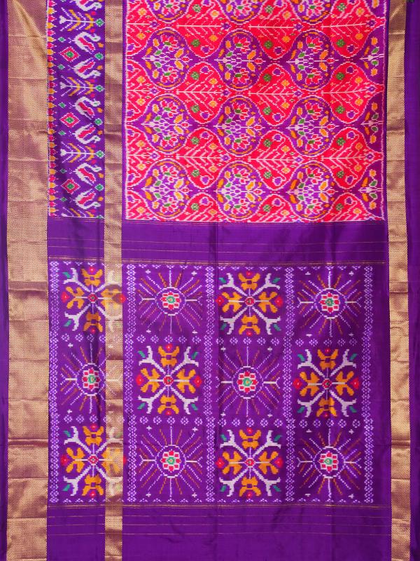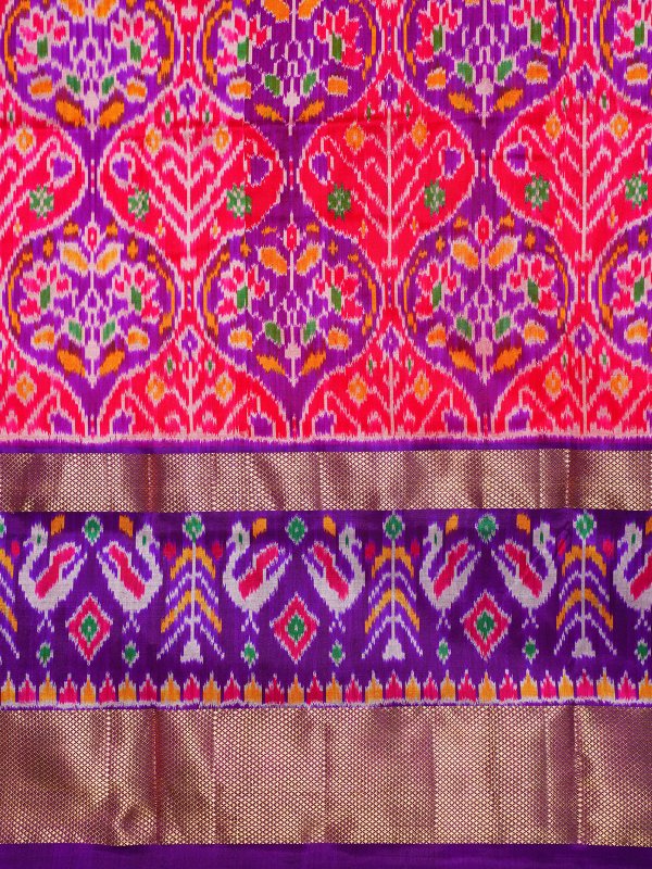 This blue pink handloom Pochampally silk Ikat saree from Telangana has beautiful patterns made using a traditional dyeing method. Pochampally Ikat is a very old weaving style where the threads are dyed before weaving, which creates unique designs. The soft mulberry silk fabric gives the saree a nice, smooth fall. The bright colours and geometric patterns make it stand out. This saree is a great choice for special occasions and for anyone who loves real, traditional Indian handloom.